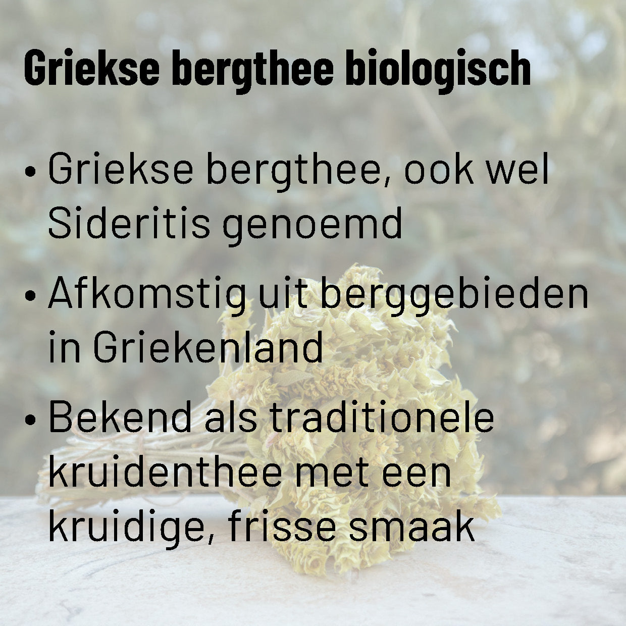 Griekse bergthee, ook bekend als Sideritis of ‘shepherd’s tea’, wordt gemaakt van de bloeiende toppen en bladeren van de Sideritis-plant. Deze traditionele thee uit Griekenland heeft een zachte, lichtzoete smaak met hints van munt en citrus. Griekse bergthee wordt al eeuwenlang gewaardeerd vanwege zijn kalmerende en gezondheidsbevorderende eigenschappen.