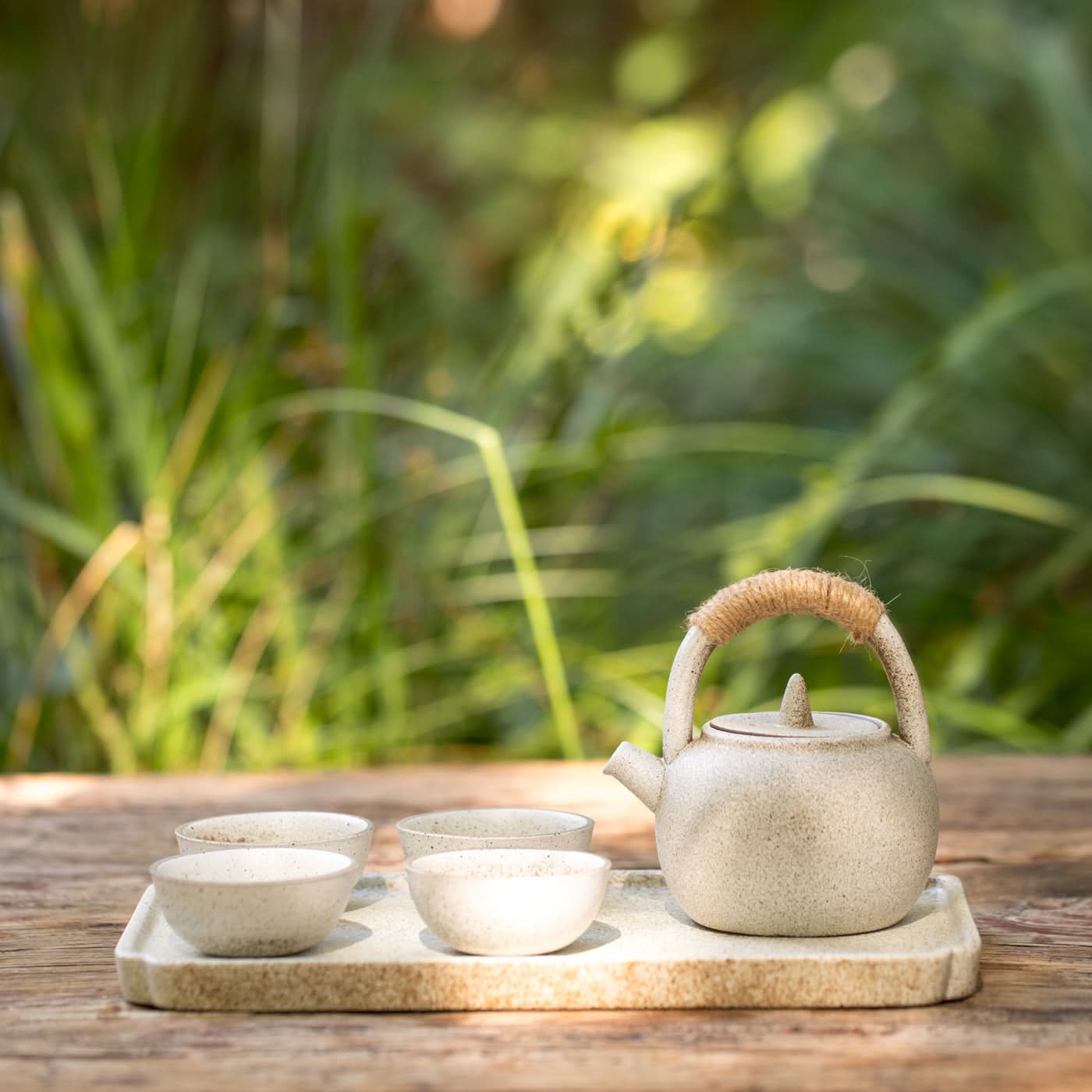De Gohobi Japanse theeset in wit keramiek straalt rust en eenvoud uit. Perfect voor wie thee drinken ziet als een moment van balans. De set bestaat uit een handgemaakte theepot (250 ml) met touwomwikkeld hengsel, vier kleine kopjes (40 ml per stuk) en een bijpassende tray van 26 x 15 cm.