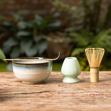 Bereid matcha op authentieke wijze met deze complete set in een frisse kleurstelling. De keramische kom heeft een crèmekleurige basis met een glazuurafwerking in diepe blauw- en bruintinten, waardoor elke kom net even anders is.