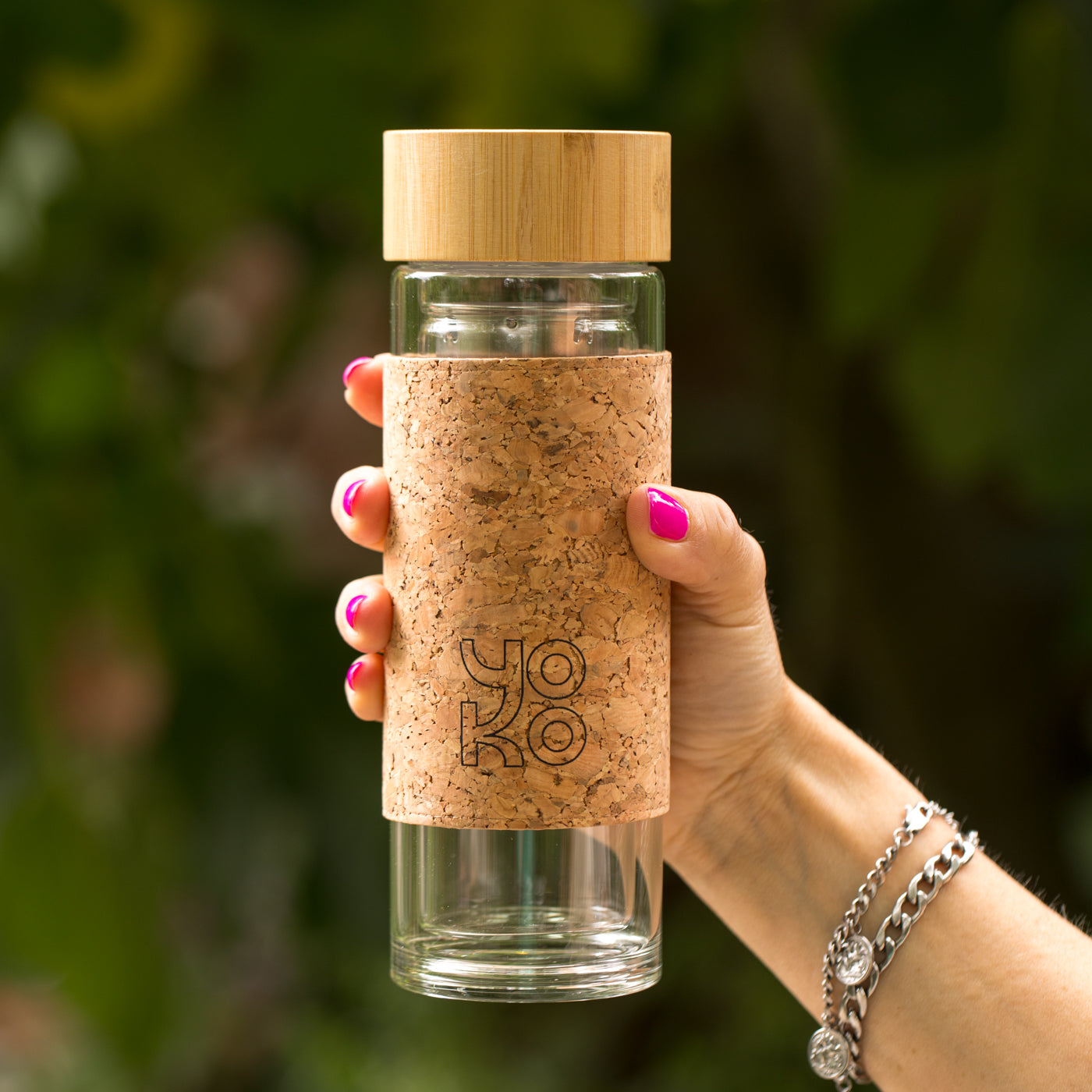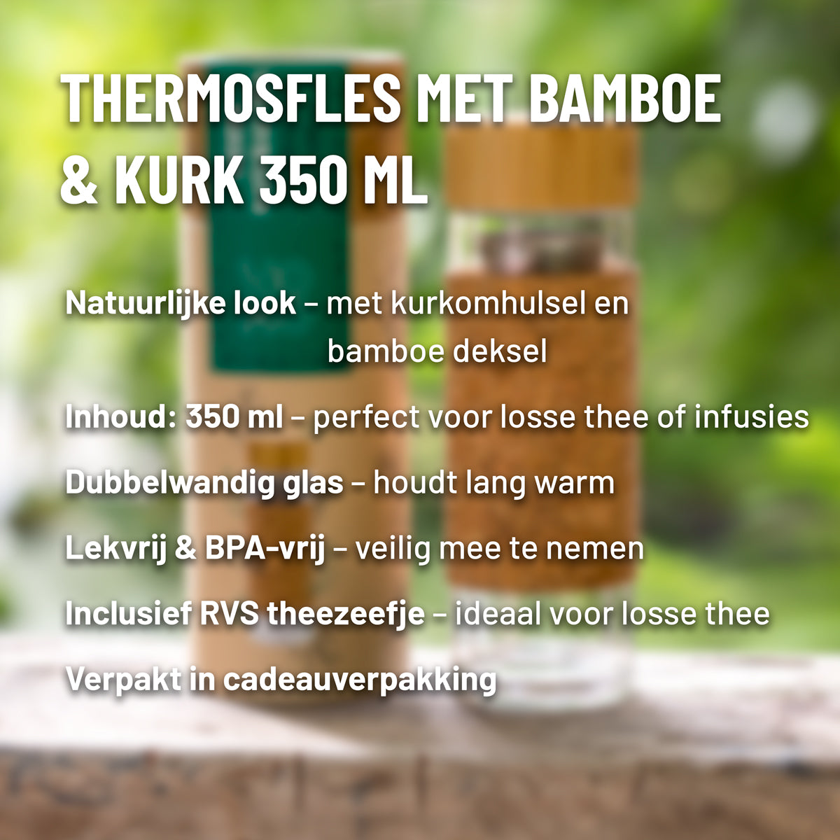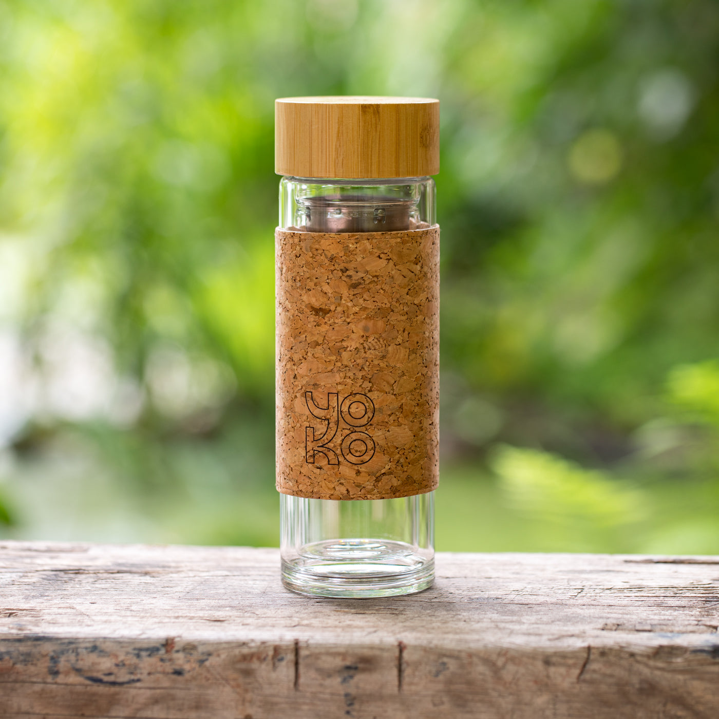 De kurkomhulling beschermt je handen én het glas, en geeft de fles een warme, natuurlijke uitstraling. De deksel is afgewerkt met bamboe en sluit stevig af dankzij een lekvrije schroefdop. Binnenin vind je een theefilter zodat je ook losse thee gemakkelijk kunt gebruiken.