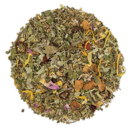 Anijs*, braambladeren*, venkel*, appel*, rozenbottel*, smalle weegbree*, pepermunt*, framboos bladeren*, vlierbloesem*, goudsbloem geel*, rozenblaadjes*.