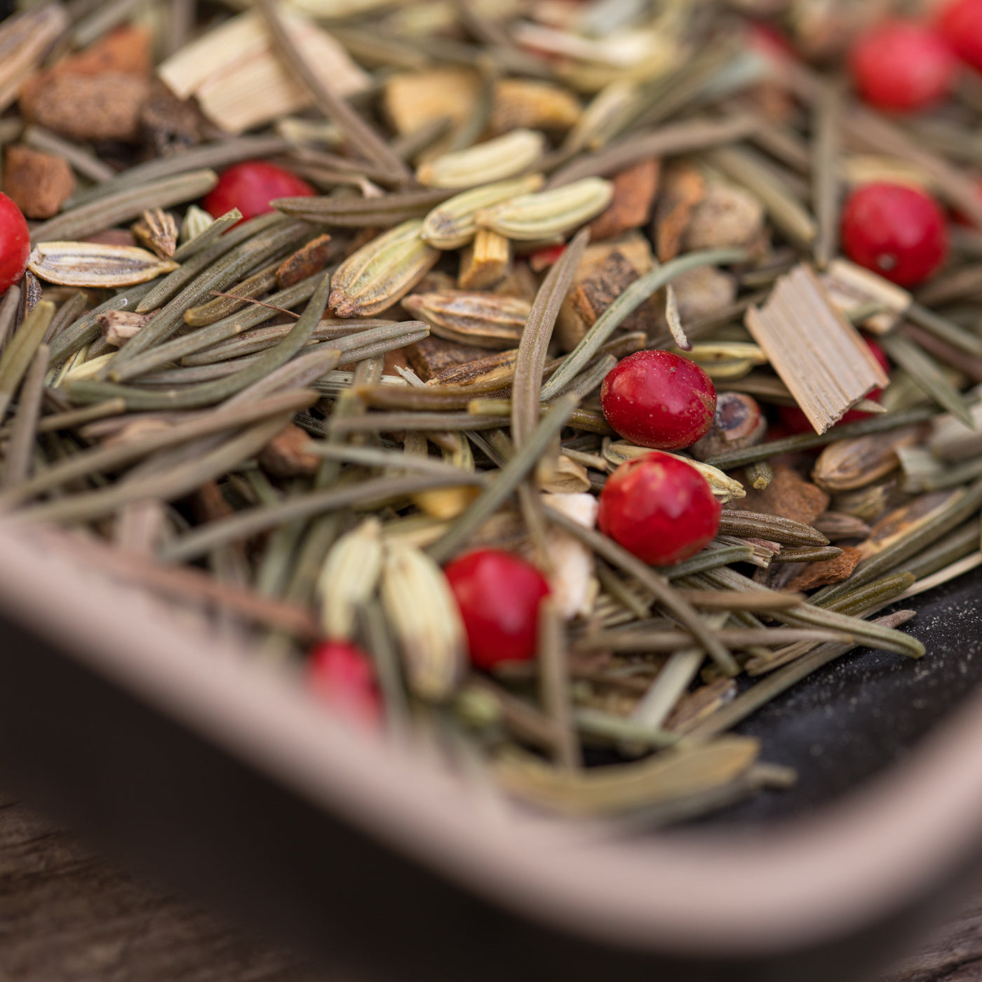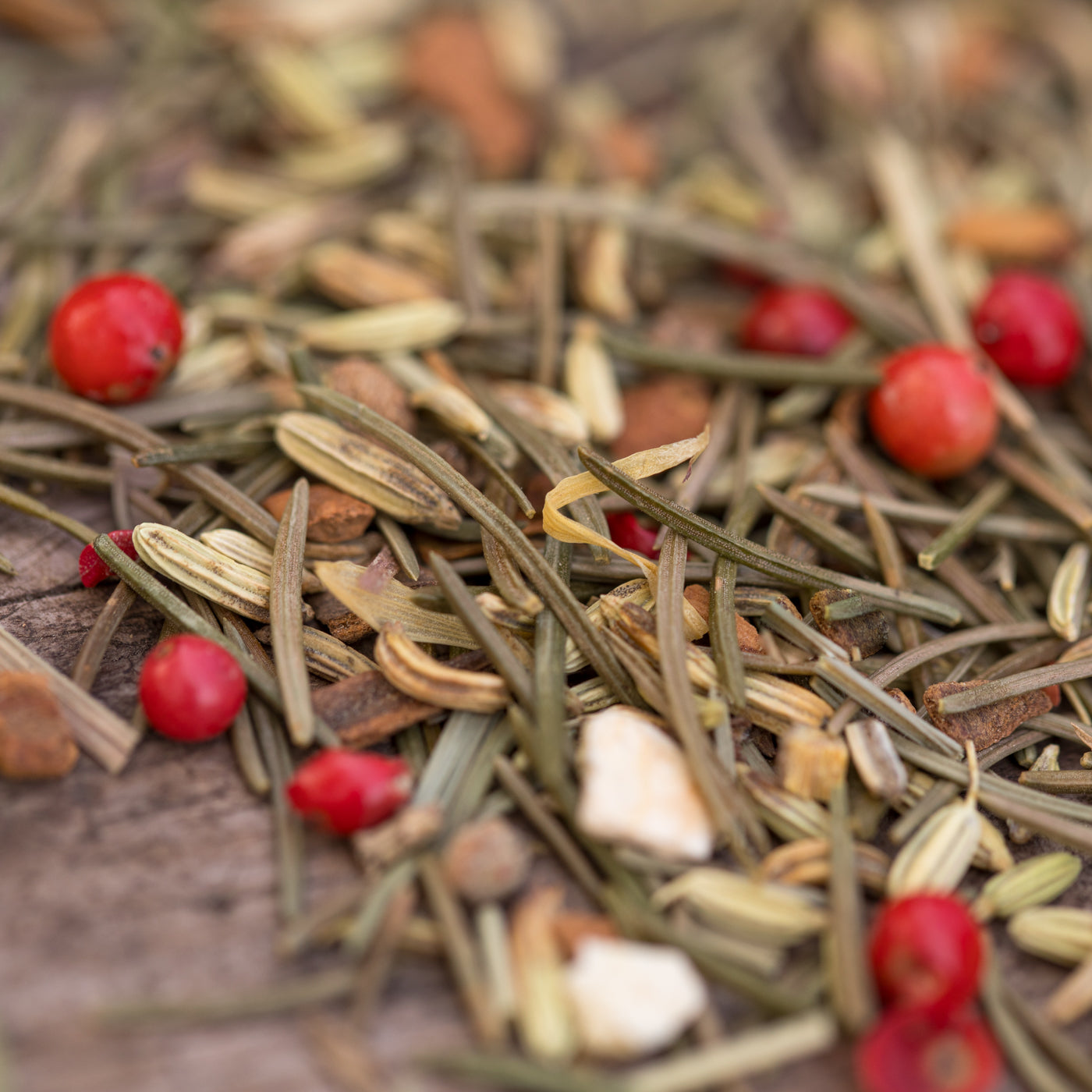 Een geurige, kruidige thee met duidelijke tonen van sinaasappel, kruidnagel en sparrennaalden. Licht zoet door het zoethout, met een frisse ondertoon van citrus. De roze peper zorgt voor een subtiel pittig randje.