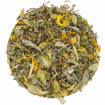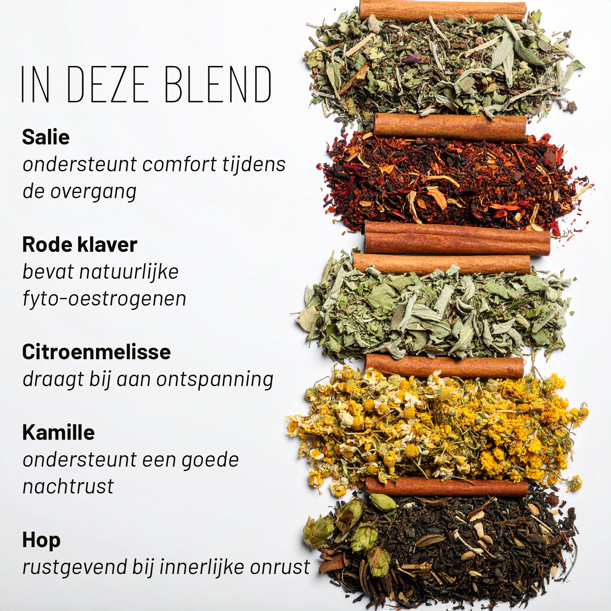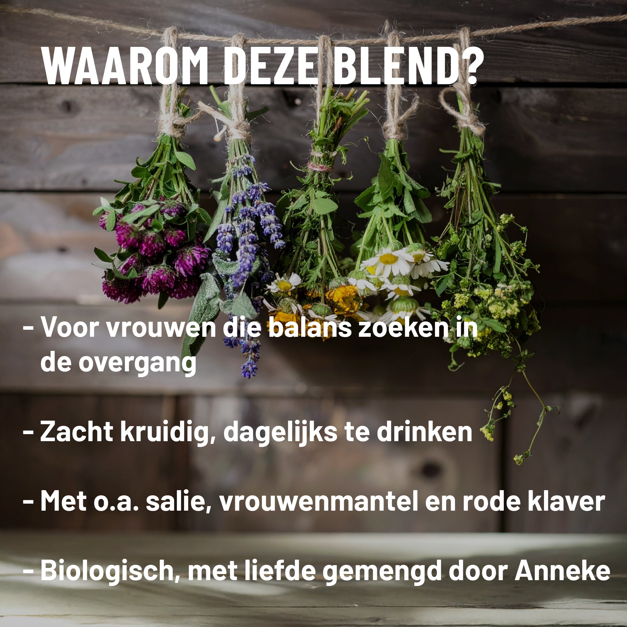 Deze kruidenblend is speciaal samengesteld voor vrouwen in de overgang. De mix bevat onder andere salie, vrouwenmantel, rode klaver en hop, kruiden die traditioneel worden ingezet bij overgangsverschijnselen. Rooibos en kamille geven een milde basis, terwijl citroenmelisse en sinaasappelschil zorgen voor een frisse ondertoon. De thee is in eerste instantie ontwikkeld voor een vriendin, maar nu ook beschikbaar voor anderen die op zoek zijn naar een natuurlijke ondersteuning tijdens de overgang.